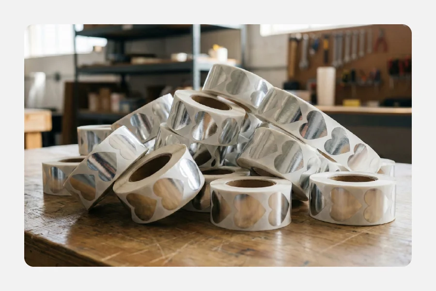 מדבקות נייר עם שכבה מטאלית בצבע כסף עם נראות יוקרתית. השכבה העליונה היא שכבה מטאלית מבריקה המעניקה מראה כסף אמיתי ומשדרגת כל מוצר.