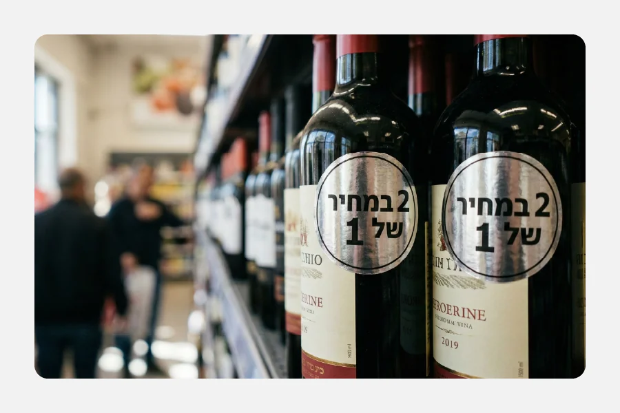 בקבוק וויסקי, קופסת קפה ושקיות תה עם מדבקות יוקרתיות הכוללות הטבעות כסף